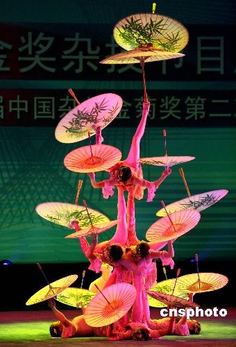 圖為由河北省雜技團演出的《詩畫韻——蹬傘》。中新社發 張勤 攝