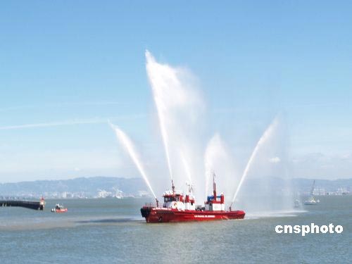 當地時間4月9日,北京奧運圣火傳遞舊金山,漁人碼頭一艘救火輪噴出沖天水柱,熱烈慶祝北京奧運圣火傳遞舊金山。作者: 盧威