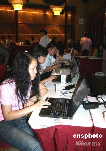 四月十一日,海南博鰲。參加博鰲亞洲論壇年會采訪的女記者,開始在新聞中心忙碌起來。中新社發 關向東 攝