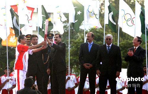 4月16日下午5時,巴基斯坦曲棍球隊前隊長義夫拉·汗從巴基斯坦總統穆沙拉夫和總理吉拉尼兩人手中接過第一棒“祥云”火炬,北京奧運圣火開始在巴基斯坦首都伊斯蘭堡傳遞。圖為巴基斯坦總統穆沙拉夫(左三)、總理吉拉尼(左五)與義夫拉·(左一)三人共舉火炬。作者: 沈晨