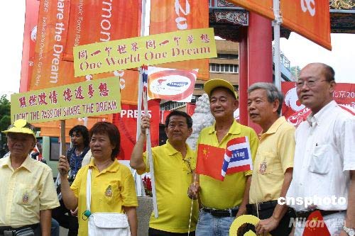 4月19日下午3時15分,祖籍中國海南的泰國第二代華裔阿南·詩里帕差臘蓬從曼谷市市長阿皮拉手中接過“祥云”火炬,北京奧運圣火在此間的傳遞正式開始。北京奧運圣火在曼谷的傳遞約10.8公里,共有80名火炬手,其中泰籍華人占一半以上。火炬自唐人街中華門出發后,途經臥佛寺、大王宮、民主紀念碑、集拉達王宮、阿南達王宮等曼谷著名景點后,最終在五世王銅像廣場舉行慶典儀式。圖為華人華僑在圣火傳遞沿途舉牌助威。 中新社發 沈晨 攝