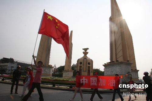 曼谷市中心的民族紀念碑被前來給火炬?zhèn)鬟f助威的中國留學生、華人華僑與當?shù)厥忻駠盟共煌ǎ巳硕家砸欢脢W運圣火為快。圖為留學生高舉國旗經(jīng)過曼谷民族紀念碑。 顧時宏 攝
