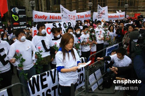 當地時間19日,在英國學習、工作和定居的華人約2000多人在倫敦舉行靜默集會,抗議包括英國廣播公司(BBC)在內的西方媒體對中國所做的不公正的、片面的報道。圖為集會組織者秦辰在宣讀抗議聲明。中新社發 李鵬 攝