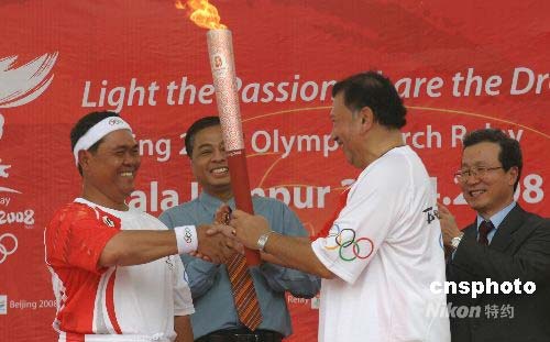 圖為第一棒火炬手、馬來西亞奧委會主席東姑伊姆拉(右)從吉隆坡市市長哈金手中接過第一棒火炬。作者: 沈晨