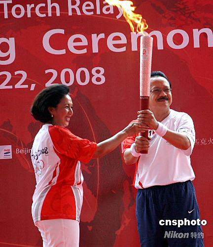 圖為雅加達站第一棒火炬手、雅加達特區省長法烏茲手(右)從印尼奧委會主席莉達手中接過火炬。作者: 沈晨