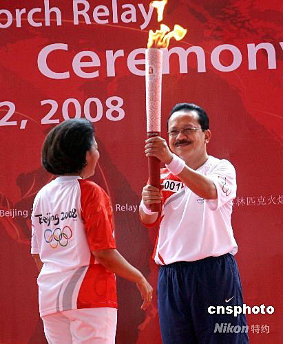圖為雅加達站第一棒火炬手、雅加達特區省長法烏茲手(右)從印尼奧委會主席莉達手中接過火炬。作者: 沈晨