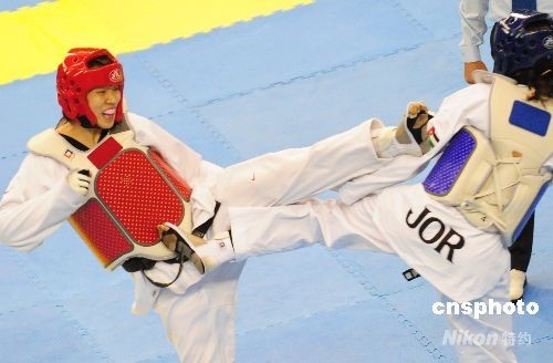 4月27日,中國選手陳中戰勝約旦選手達瓦尼獲得亞洲跆拳道女子72公斤以上級冠軍。中新社發 高山岳 攝
