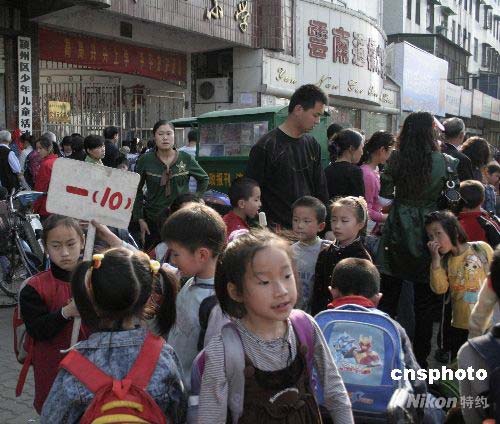 四月二十八日下午,阜陽(yáng)市清河路小學(xué)一年級(jí)學(xué)生在排隊(duì)放學(xué)。安徽省阜陽(yáng)市千余嬰幼兒童感染腸道病毒EV71后,當(dāng)?shù)卣扇〈胧┘訌?qiáng)救治,嚴(yán)守預(yù)防,減少擴(kuò)延。中新社發(fā) 張婭子 攝