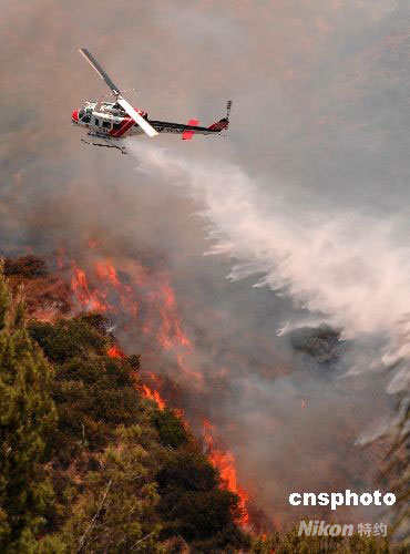 當地時間四月二十八日,消防直升機正在向著火區域撒下阻燃劑。洛杉磯近郊Sierra Madre的山林大火已經燃燒了三天,過火面積近五百英畝,部分著火點距離居民區很近。當天,當地中小學全部停課,約一千名當地居民被迫緊急撤離。這是當地三十多年來最大的山林大火。消防部門稱,美國聯邦、加州、洛杉磯縣和當地的六百名消防員正在現場滅火,至今沒有人員傷亡的報告。中新社發 張煒 攝