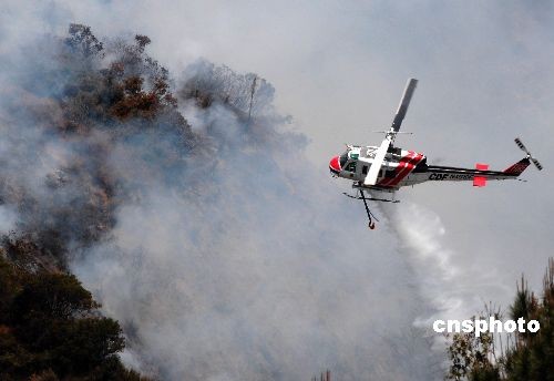 當地時間四月二十八日,消防直升機正在向著火區域撒下阻燃劑。中新社發 張煒 攝