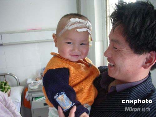 4月29日,阜陽市第二人民醫院,家長抱著已脫離生命危險的患兒在病房內笑逐顏開。家住安徽省阜陽市潁泉區蘇屯鄉孟寨大隊1歲患兒劉暢,4月17日因發熱伴手足皮疹入住該醫院,當時病情很嚴重,經醫院專家會診調整治療方案,目前病情穩定。4月29日上午,安徽省衛生廳副廳長杜昌智在通報會上說,目前阜陽共報告腸道病毒EV71感染病例1520例,其中痊愈585例,經全力搶救無效死亡20例,仍在住院治療412例,其中重癥患者26例。中新社發 張婭子 攝