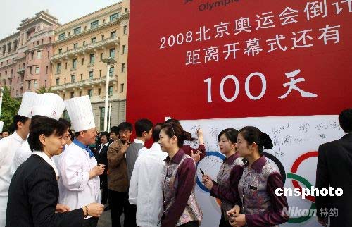 北京飯店千名員工,以及天安門國(guó)旗護(hù)衛(wèi)隊(duì)、中國(guó)人民解放軍軍樂(lè)團(tuán)參加迎奧運(yùn)倒計(jì)時(shí)100天千人簽字活動(dòng)。中新社發(fā) 錢興強(qiáng) 攝