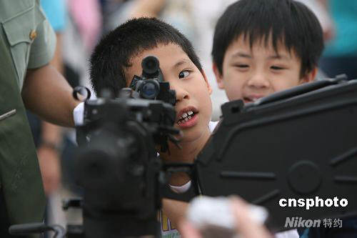 圖為一名小朋友在輕武器展示區認真瞄準目標。中新社發 武仲林 攝