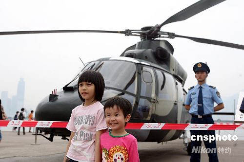 圖為市民在昂船洲軍營與軍用直升機合影。中新社發 武仲林 攝