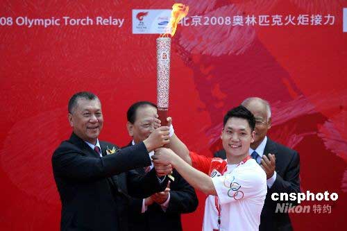 圖為澳門特別行政區行政長官何厚鏵將火炬交給首棒火炬手、武術運動員梁洪敏。中新社發 武仲林 攝
