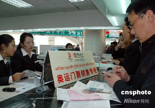 在西藏奧運會門票銷售點的中國銀行西藏自治區(qū)分行里,購買奧運會門票的市民排起了長長的隊伍。 中新社發(fā) 周波 攝