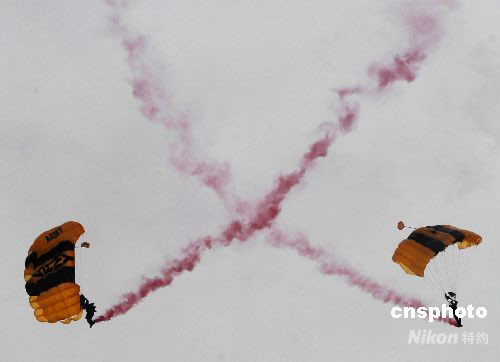 圖為美軍“金騎士”跳傘隊表演“空中芭蕾”。中新社發 張煒 攝