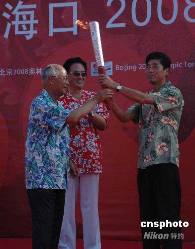 圖:奧運圣火使者何振梁在海口傳遞火炬