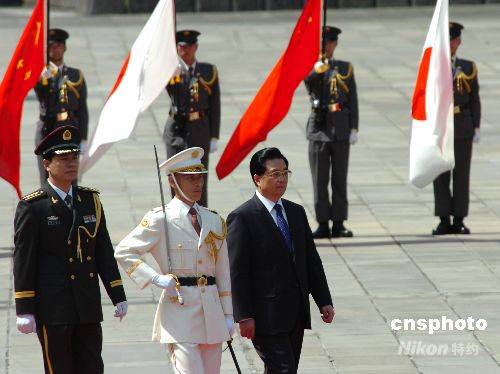 圖為胡錦濤在歡迎儀式上檢閱日本儀仗隊。中新社發 朱沿華 攝