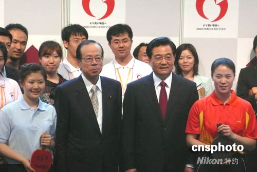 圖為胡錦濤主席打完球后與日本首相福田康夫、中國乒乓球運動員王楠、日本乒乓球運動員福原愛合影留念。