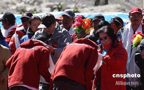 5月10日,北京奧運火炬接力珠峰傳遞中國登山隊凱旋慶祝儀式在珠峰大本營舉行。西藏自治區政府主席向巴平措(左)、國家體育總局副局長胡家燕等領導出席慶祝儀式并向登珠峰勇士獻上潔白的哈達。 中新社發 盛佳鵬 攝