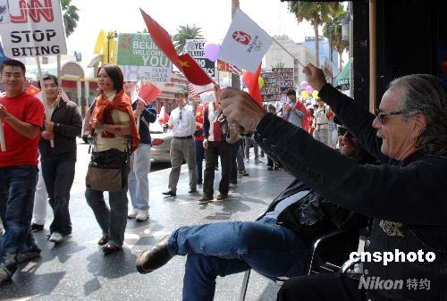 當地時間5月10日,通過網絡自發組織的南加州數百名華人華僑、留學生在洛杉磯著名的好萊塢星光大道上參加支持北京奧運集會游行活動。游行活動在歡歌笑語中進行,沿途受到一些洛杉磯市民的支持和響應。 中新社發 張煒 攝