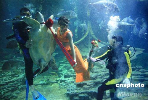 5月11日,在武漢東湖海洋世界,一只百歲雌性海龜“披紅掛彩”,“接受”潛水員獻上的康乃馨和“美人魚”的親吻,歡度“母親節”。中新社發 王振武 攝