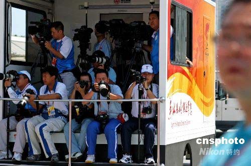 圖為采訪車上的記者嚴(yán)陣以待,拍攝圣火傳遞。中新社發(fā) 傅丹丹 攝