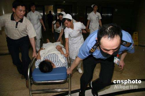 5月12日下午,四川汶川發生7.8級地震,地震后,四川省人民醫院醫生、護士迅速轉移患者到安全地帶。中新社發 黃家明 攝