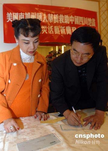 圖為南加州華人華僑聯合總會會長程遠(右)當場填寫支票向災區捐獻一千美元。中新社發 張煒 攝