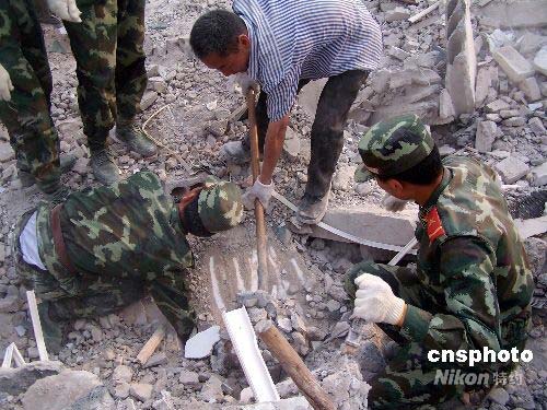 5月12日下午,四川汶川發(fā)生7.8級地震,導(dǎo)致重慶梁平縣文化鎮(zhèn)中心小學(xué)坍塌,武警重慶總隊(duì)梁平縣中隊(duì)官兵在中隊(duì)指導(dǎo)員唐兵的帶領(lǐng)下緊急趕赴現(xiàn)場展開搜救。經(jīng)過官兵們連續(xù)6個小時的艱苦奮戰(zhàn),從廢墟中成功救出11名師生。(李剛、陳萬金、秦龍兵攝影報道)