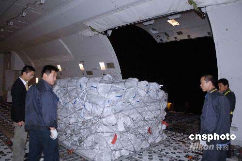 5月14日凌晨,深航旗下中德合資翡翠航空大型貨機(jī)JI7452航班滿載四千頂救災(zāi)帳篷,從天津濱海機(jī)場裝機(jī)運(yùn)往四川地震災(zāi)區(qū)。中新社發(fā) 陳文 攝