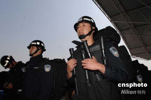 5月13日中午12時,天津公安局特警總隊200名特警隊員攜帶破拆工具、地高壓氣墊手動救援工具組照明及通訊等工具在天津國際濱海機場登機,13時44分乘國際航空公司包機飛赴四川,當天下午4時46分抵達四川成都,按照公安部的指令即將奔赴北川重災區,投入到維護災區社會治安和搶險救災工作中。中新社發 蘇振強 攝
