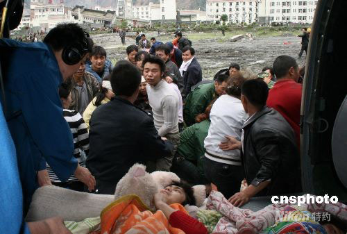 5月14日,成都軍區某陸航團四架直升機滿載帳篷、礦泉水等災區急需物資成功降落汶川災區,為災民送去了生活必需品。當日中午,第一批40名重傷員隨機返抵成都,被送往醫院救治。中新社發 張雷 黃龍 攝