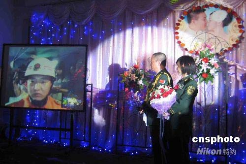 遼寧省遼陽市白塔消防大隊鐵西中隊副中隊長郎猛赴四川抗震救災,他與陜西省寶雞市扶風消防大隊副指導員常芳的婚禮如期舉行。5月17日,新娘常芳在郎猛的家鄉遼寧省新民市舉行了一場特殊的婚禮。中新社發 沈殿成 攝