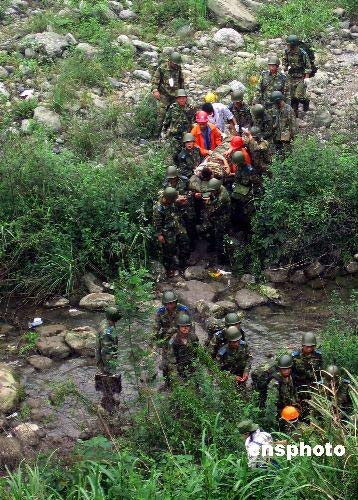 16日上午,師政治部主任高鵬帶領救援突擊隊和醫療小分隊172人,從綿竹市漢旺鎮出發向重災區天池鄉幾個村里運送救援物資,幫助群眾撤離震區。11時左右,當部隊行至高橋以西500米處,突然發生余震,導致大量山石從山頂傾斜而下,直接威脅著正在這個路段通過的群眾。作訓參謀祝紅杰突然發現一個孩子癱倒在石堆上,急忙上前搶抱他,孩子得救了,祝紅杰卻被亂石砸斷左腿,當場倒地。作訓參謀胡國才眼見一塊亂石砸向老人,極力將老人推到一邊,自己的頭部卻被亂石砸傷暈倒在地。同時,該團還有一名司務長和兩名戰士在救援中被泥石流砸傷……  看到解放軍為救災區群眾身負重傷,在現場的一些救災志愿者迅即投入搶救部隊官兵的行動中。運送途中山路險峻,他們拉一把、推一把,爭先恐后出把力氣。擔負救援撤離群眾任務的重慶市高新區人民醫院的醫護人員聞訊后,一邊流著熱淚,一邊實施現場救護,為他們贏得了寶貴的救治時機……