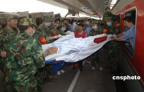 組圖:地震災(zāi)區(qū)首趟運(yùn)送傷員專(zhuān)列順利抵達(dá)重慶(4)