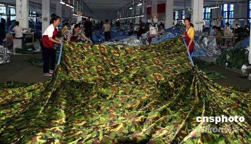 5月28日,揚州舉行萬頂帳篷發往災區的發車儀式。圖為中國最大的戶外帳篷生產企業江蘇阿珂姆野營用品公司生產車間,目前正承擔著民政部下達的12萬頂救災帳篷生產任務。連日來,3500名員工在全力以赴加班加點生產帳篷,日產帳篷可達5000頂左右,5月30日后日產量預計可達6000頂以上。6月20日前,完成民政部下達的救災帳篷生產任務。中新社發 崔佳明 攝