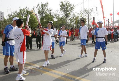 5月29日上午7時,奧運火炬接力安徽的傳遞活動在“能源之都”淮南傳遞。淮南籍央視主持人周濤傳遞火炬第一棒。中新社發 張婭子 攝