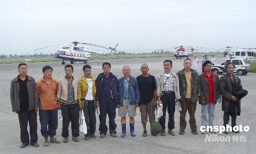 5月29日下午,被困17天的10名清平磷礦礦工,被民航直升機(jī)救出。剛走下飛機(jī)的被救礦工付學(xué)斌說(shuō),這17天來(lái)靠吃野菜和直升機(jī)空投的食品維持生命。5月12日那天,地震時(shí)他們都在磷礦上班,傷亡不是很大,主要是在家的親人都被這次地震給吞沒(méi)了。執(zhí)行這次營(yíng)救任務(wù)的是中信海直的AS332型7961號(hào)和東方通用航空的米171型7856號(hào)飛機(jī)。據(jù)民航直升機(jī)抗震指揮部副總指揮關(guān)立欣講,受天氣影響,全天共出動(dòng)直升機(jī)10架次,執(zhí)行飛行任務(wù)24架次,運(yùn)進(jìn)救災(zāi)物資10.1噸,救援人員13人,接運(yùn)出被困群眾和傷員47人,財(cái)務(wù)檔案600公斤。中新社發(fā) 張鈺昱 攝