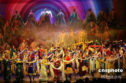 5月31日晚,西藏自治區文藝界舉行《幸福在路上》主題匯演,此系四川大地震后西藏首場大型演出,雪域兒女以吉祥哈達祝福祖國、祝福四川、祝福北京奧運會。中新社發 賈長飛 攝