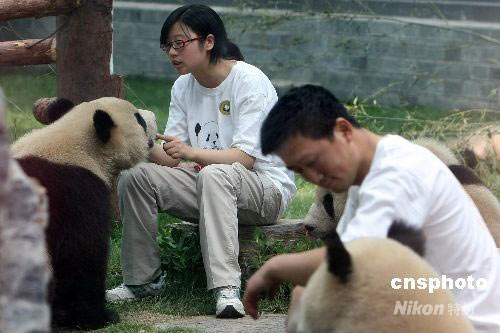 6月5日上午,八只臥龍“奧運大熊貓寶寶”在北京動物園的新家中首次公開亮相。這些1歲多的“小國寶”不時需要臥龍來的飼養員用四川鄉音安撫它們在5·12大地震中受到驚嚇的心靈。 中新社發 任晨鳴 攝