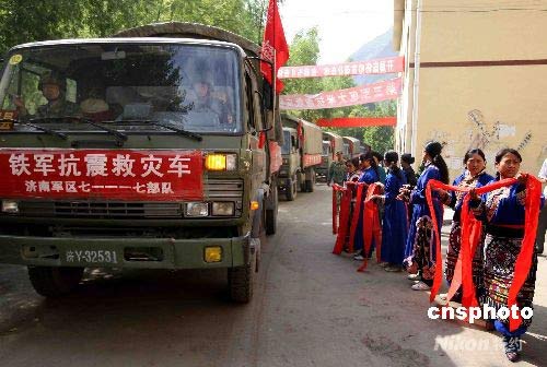 羌族民眾手捧象征平安的紅綢迎接車隊。中新社發 曾憲平 攝
