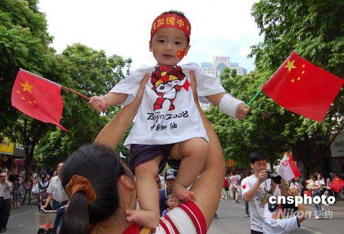 6月7日,北京奧運(yùn)火炬在廣西南寧傳遞,當(dāng)?shù)孛癖姛崆樗苹鹣灿セ稹V行律绨l(fā) 劉萬(wàn)強(qiáng) 攝
