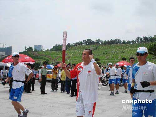 享有“亞洲飛人”美譽的廣西短跑名將陳文忠接過圣火,跑進南寧國際會展中心點燃圣火盆。中新社發 黃艷梅 攝