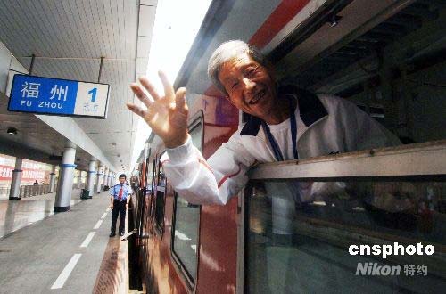 圖為列車發車前呂天其老人與前來送行的有關人員揮手道別。中新社發 劉可耕 攝