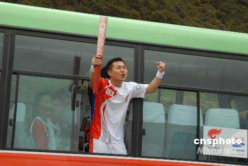 一位火炬手結束傳遞活動前往結束儀式途中,手舉祥云火炬,高喊“中國加油”。中新社發 石雨 攝