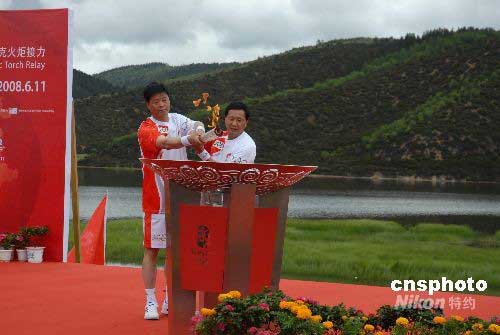 6月11日11時,奧運圣火香格里拉傳遞的最后一棒由香格里拉縣委書記彭耀文(左)和中國著名長跑運動員張國偉共同完成,祥云圣火在普達措國家公園完成香格里拉最后的傳遞線路。隨后兩名火炬手在屬都湖邊點燃圣火盆,奧運圣火傳遞香格里拉站圓滿結束。
