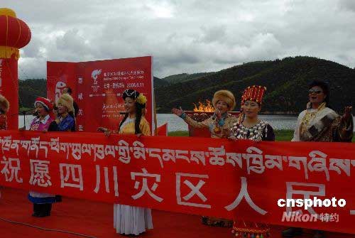 奧運圣火在云南香格里拉傳遞,在結(jié)束儀式現(xiàn)場,全場共同高歌《一個媽媽的女兒》,為四川災區(qū)人民祝福。 中新社發(fā) 石雨 攝