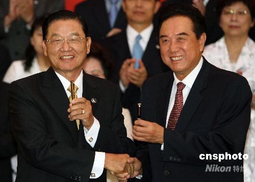 峽兩岸關系協會會長陳云林(右)與臺灣海峽交流基金會董事長江丙坤在簽署“兩岸周末包機”和“大陸居民赴臺旅游”協議后,交換簽字筆。中新社發 任晨鳴 攝